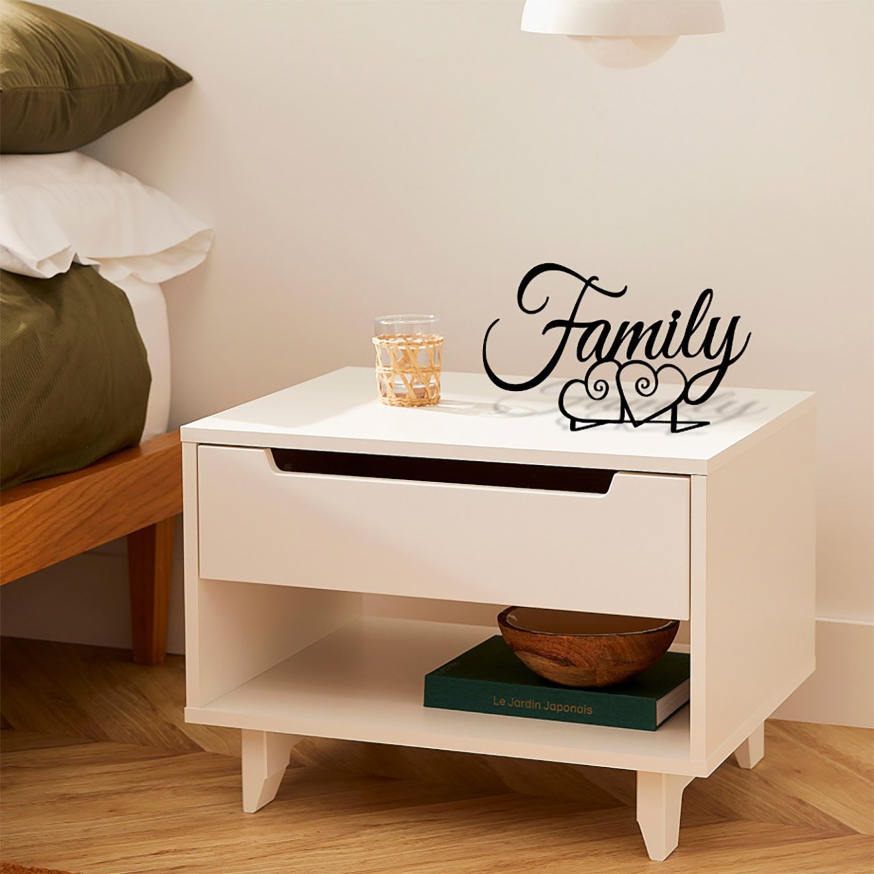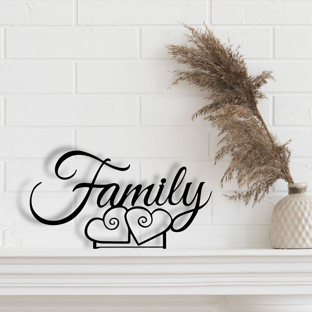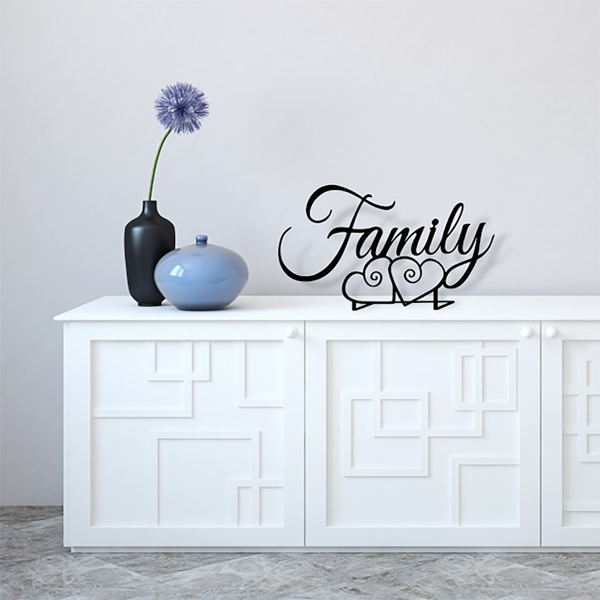 העיצוב שמסמל משפחתיות ואהבה בשילוב מילת פאמילי עם זוג לבבות בצורה עדינה ומעוטרת.