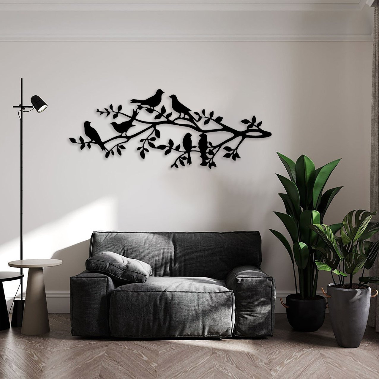 עיצוב קיר מרהיב ממתכת, המתאר ציפורים על ענף עץ, שילוב מושלם בין טבע לאומנות.