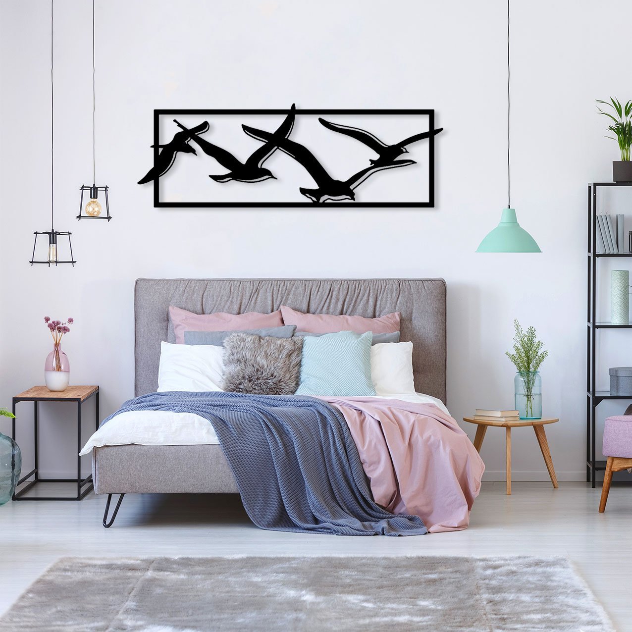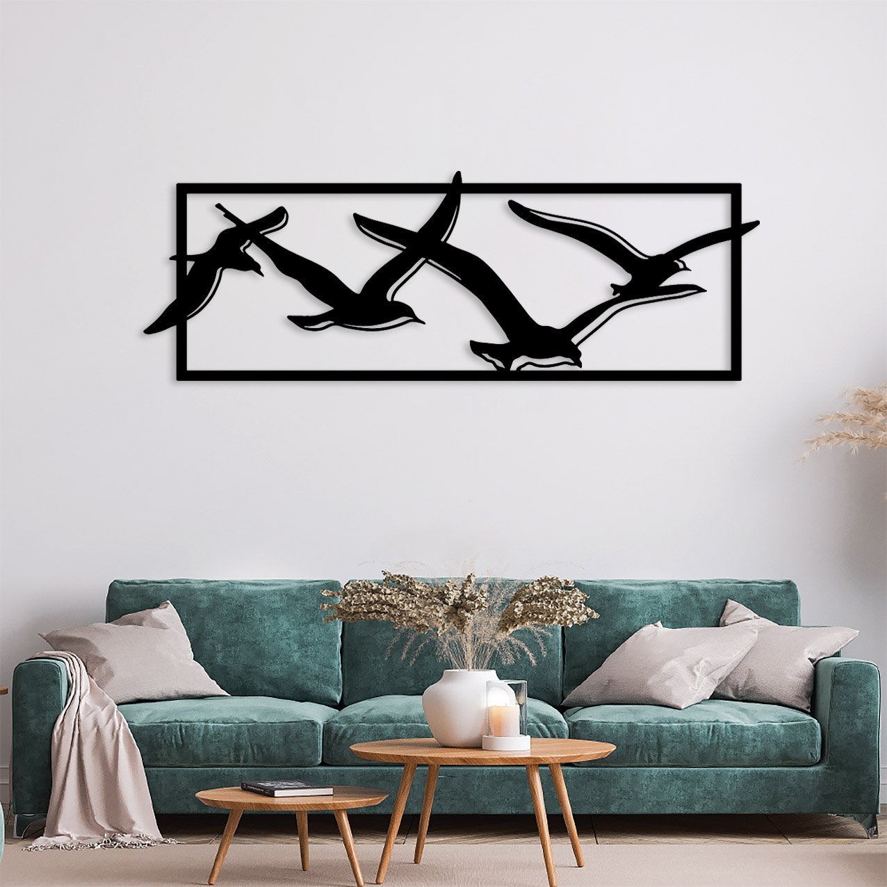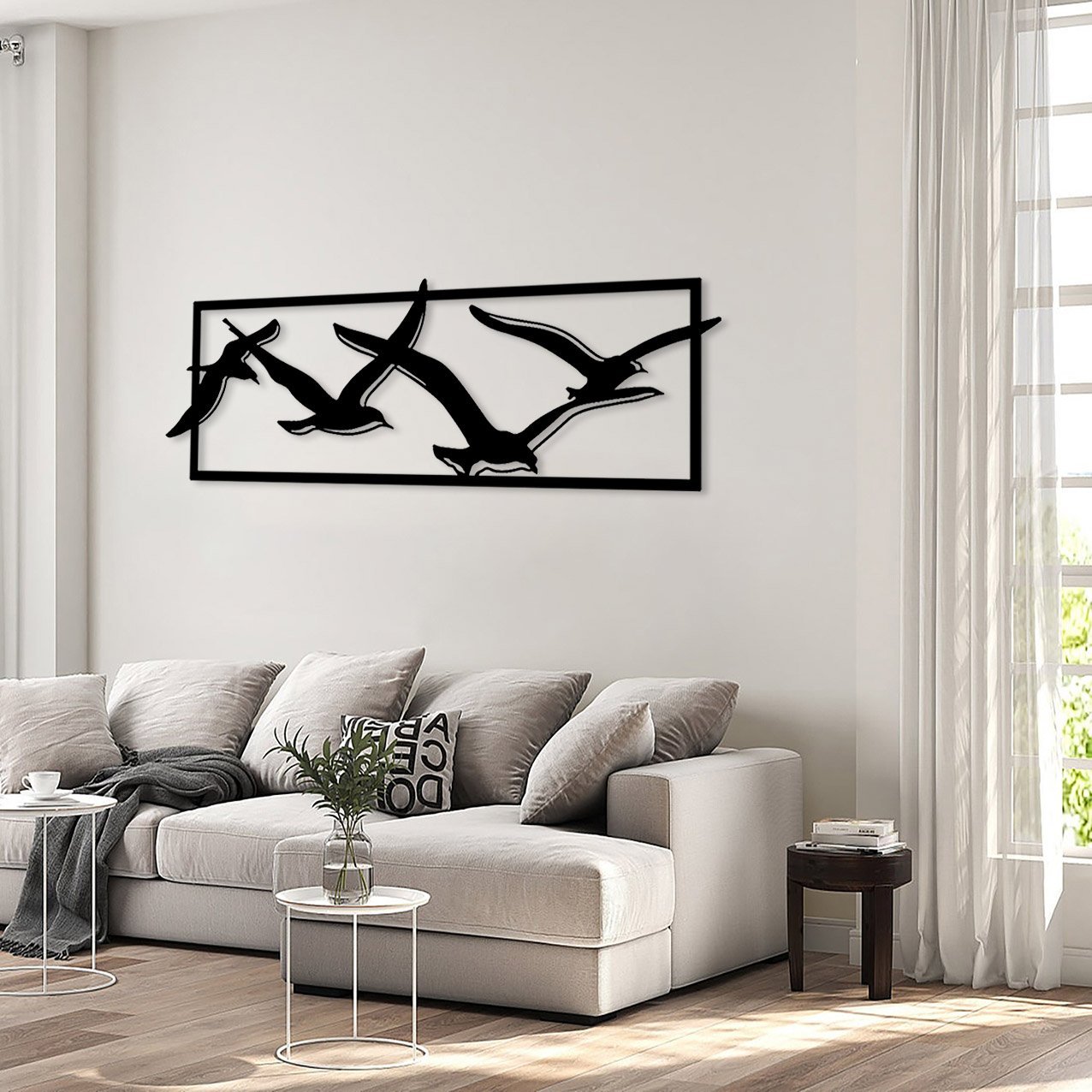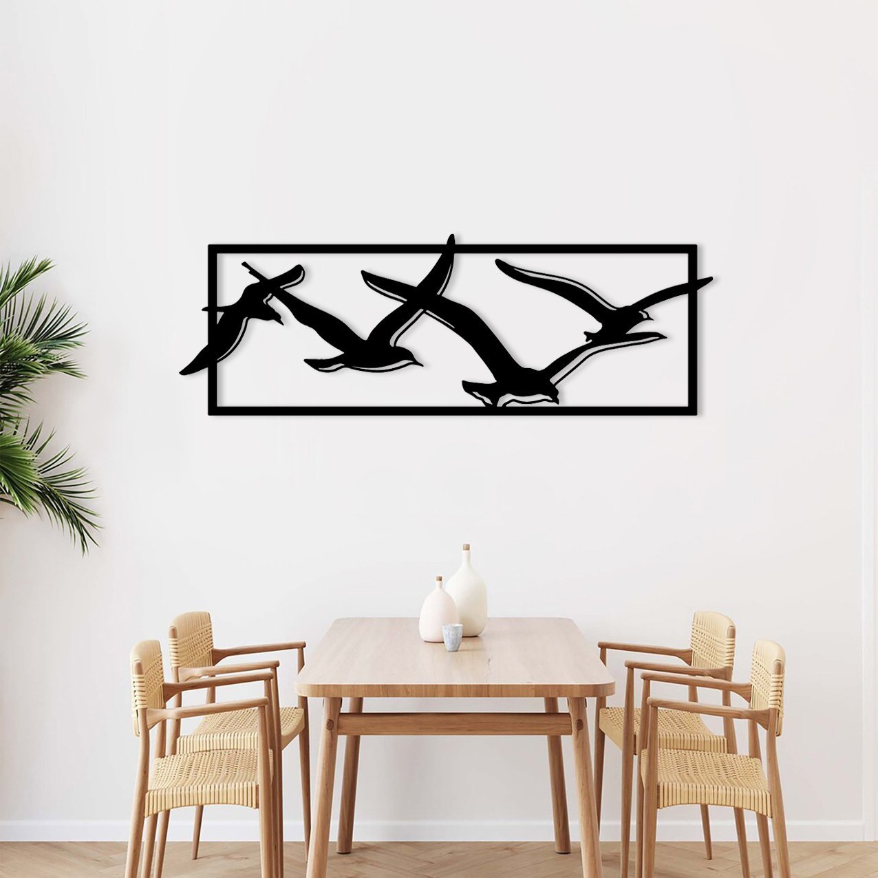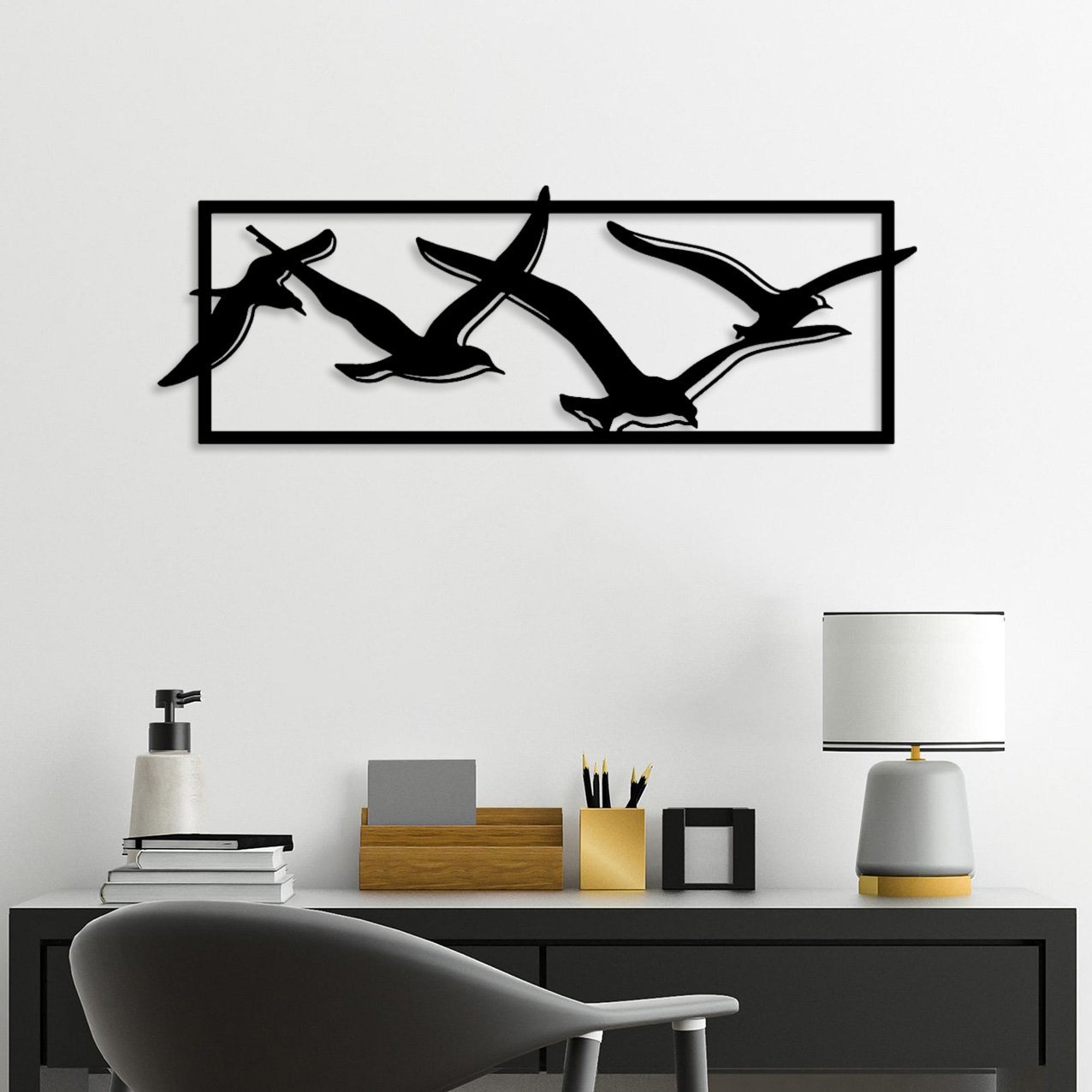 העיצוב “להקת ציפורי החופש” מציג קבוצת ציפורים מעופפות, בעבודת מתכת.