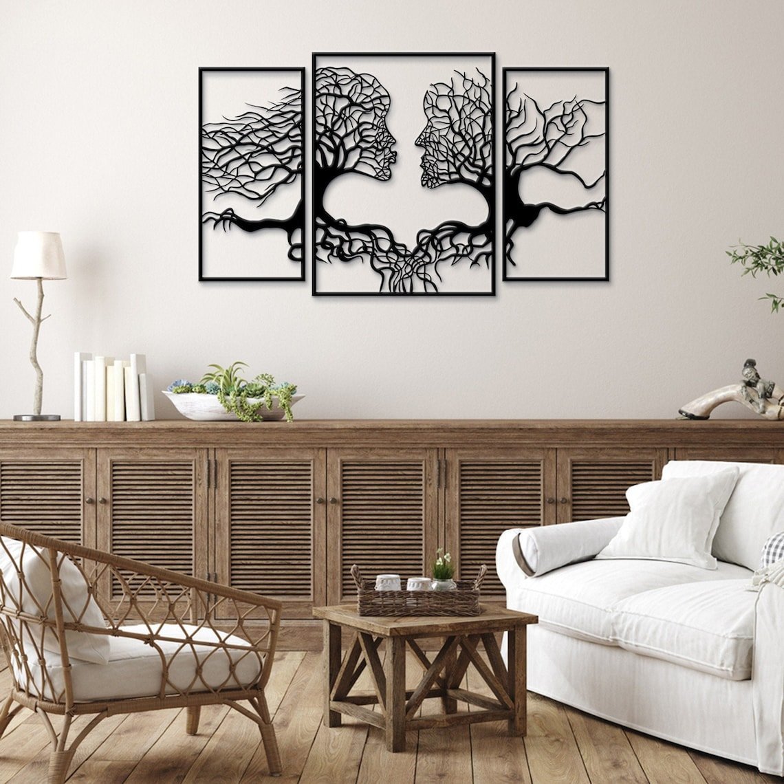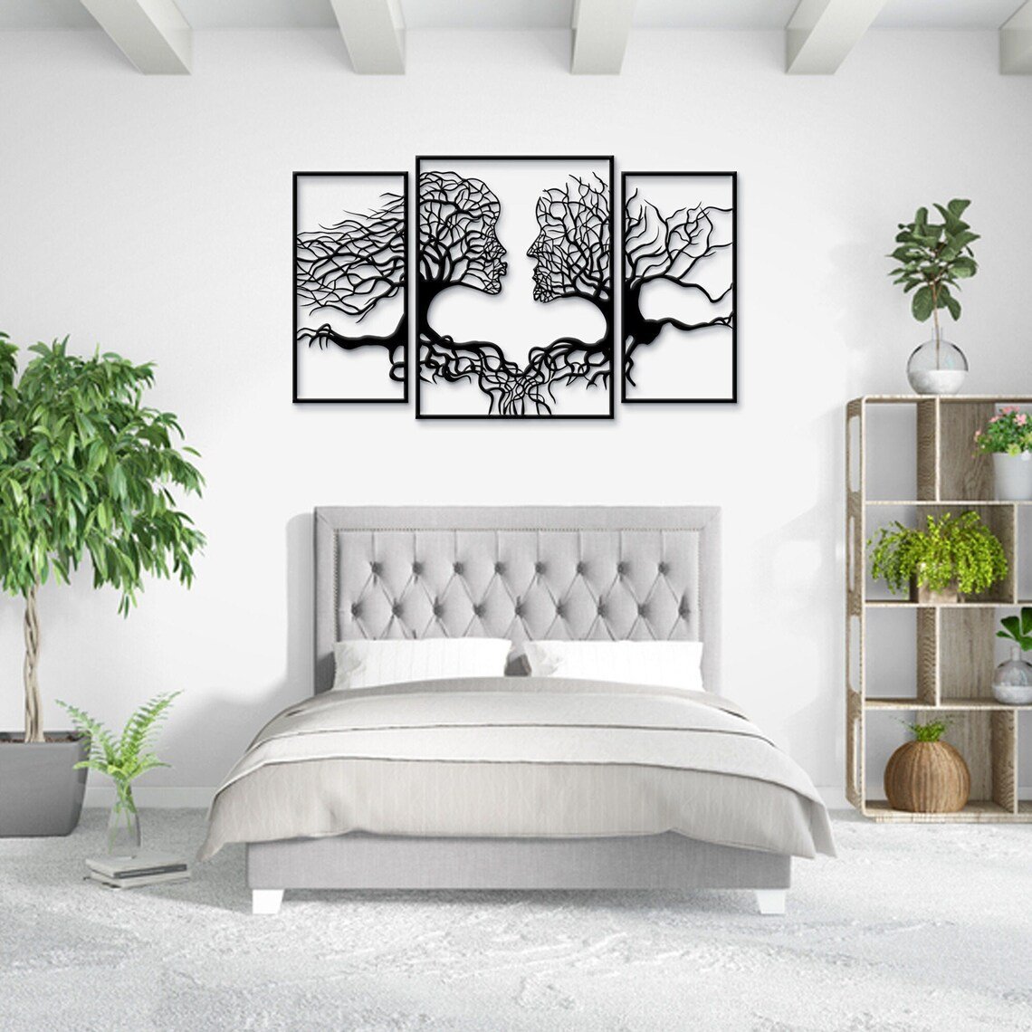 סט של שלושה עיצובי קיר מהממים ממתכת איכותית המרכיבים יחד שני עצים הקשורים זה בזה בשורשים ומשקפת פנים של גבר ואישה כזוג אוהבים.