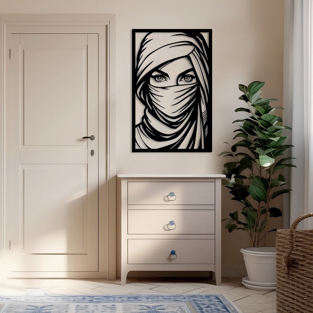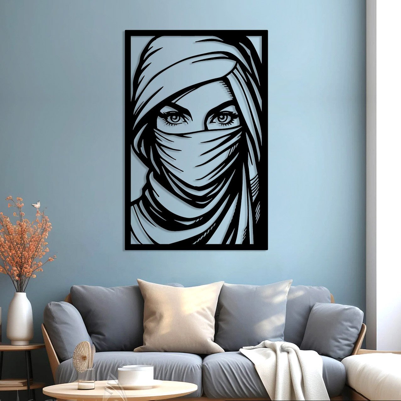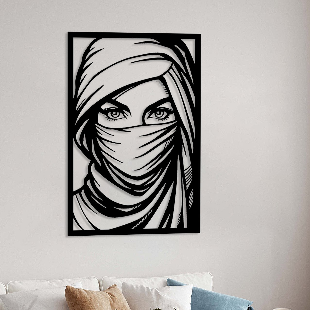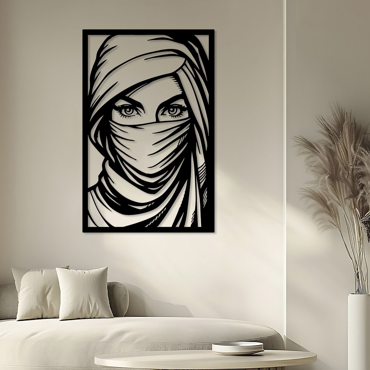 יצירת אומנות מרהיבה בקווי מתכת מדויקים, המציגה דמות עטופה במטפחת מדברית,
